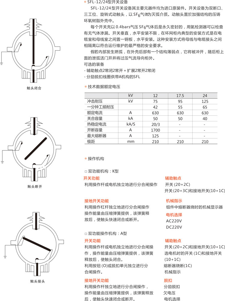 環網柜的主開關、操作機構及元器件采用ABB公司原裝件或采用進口部件國內組裝生產的SFL-12/24型 開關設備,也可根據用戶需要配裝ABB公司原裝HAD/US型SF6。斷路器或VD4-S型真空斷路器,其操作方式分為手動、電動兩種。