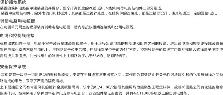 4.主回路與輔助電路之間設計成分隔結構,儀表、信號燈和按鈕等組成的輔助電器單元,均安裝于塑料板上,板后用阻燃型聚胺脂發泡塑   料做成的罩殼與主回路分離。