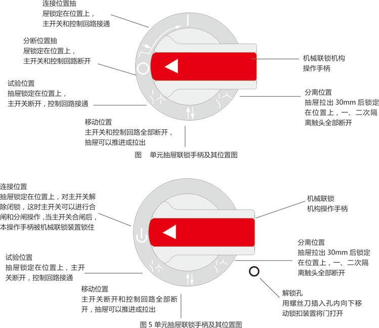 ◎ 抽屜單元有可靠的機械聯鎖位置。通過操作手柄控制,具有明顯準確的合閘、試驗、抽出和隔離位置。操作機構功能見圖4、圖5。